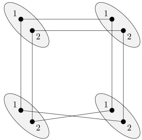 Figure 1: The cycle on four vertices has Alon-Tarsi number 2, but is not 2-correspondence-colorable.