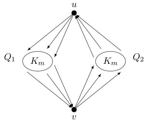 To form , we orient the edges from towards the clique , and we orient the edges from towards . We orient the edges incident to oppositely: we orient the edges from towards , and we orient the edges from towards the clique . We orient the edges within the cliques and acyclically, so that they are isomorphic to the transitive tournament on vertices. See Figure 2 for an illustration of . Observe that the maximum outdegree of the orientation is .
