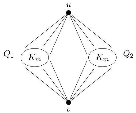 Definition 5. Let be an even integer at least 4. The -vertex graph is constructed by taking two disjoint graphs isomorphic to , where , and adding every possible edge to two independent vertices, and . In other words, is joined to . See Figure 2.